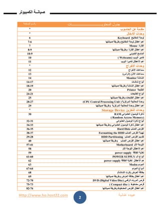 يتناول هذا الوثيقة صيانة أجهزة الكمبيوتر، مع التركيز على مكونات إدخال وإخراج المعلومات وكيفية التعامل مع الأعطال الشائعة. تشمل المكونات لوحة المفاتيح، الفأرة، الماسح الضوئي، وطباعة الأجهزة، إضافة إلى وحدات التخزين والمعالجة. كما يتضمن توجيهات لصيانة كل مكون واستكشاف الأخطاء وإصلاحها.