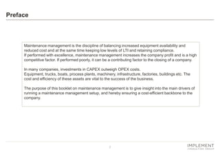 The document discusses key concepts in maintenance management. It emphasizes balancing equipment availability, costs, safety and compliance. Good maintenance management increases profits and competitiveness, while poor maintenance can threaten a company's survival. The document outlines ten areas for improvement in maintenance systems, including asset management, spare parts, planning, processes and data management. It stresses the importance of standardization, data quality and alignment with overall business strategy to optimize availability, costs, safety and compliance through continuous improvement.