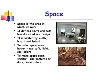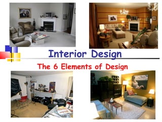 The document outlines the six elements of interior design: space, line, form, texture, pattern, and color. It provides guidance on how to utilize these elements effectively, such as using color to manipulate the perception of space and the importance of texture and pattern in creating visual interest. Additionally, it emphasizes the psychological and emotional impact of color in interior design.
