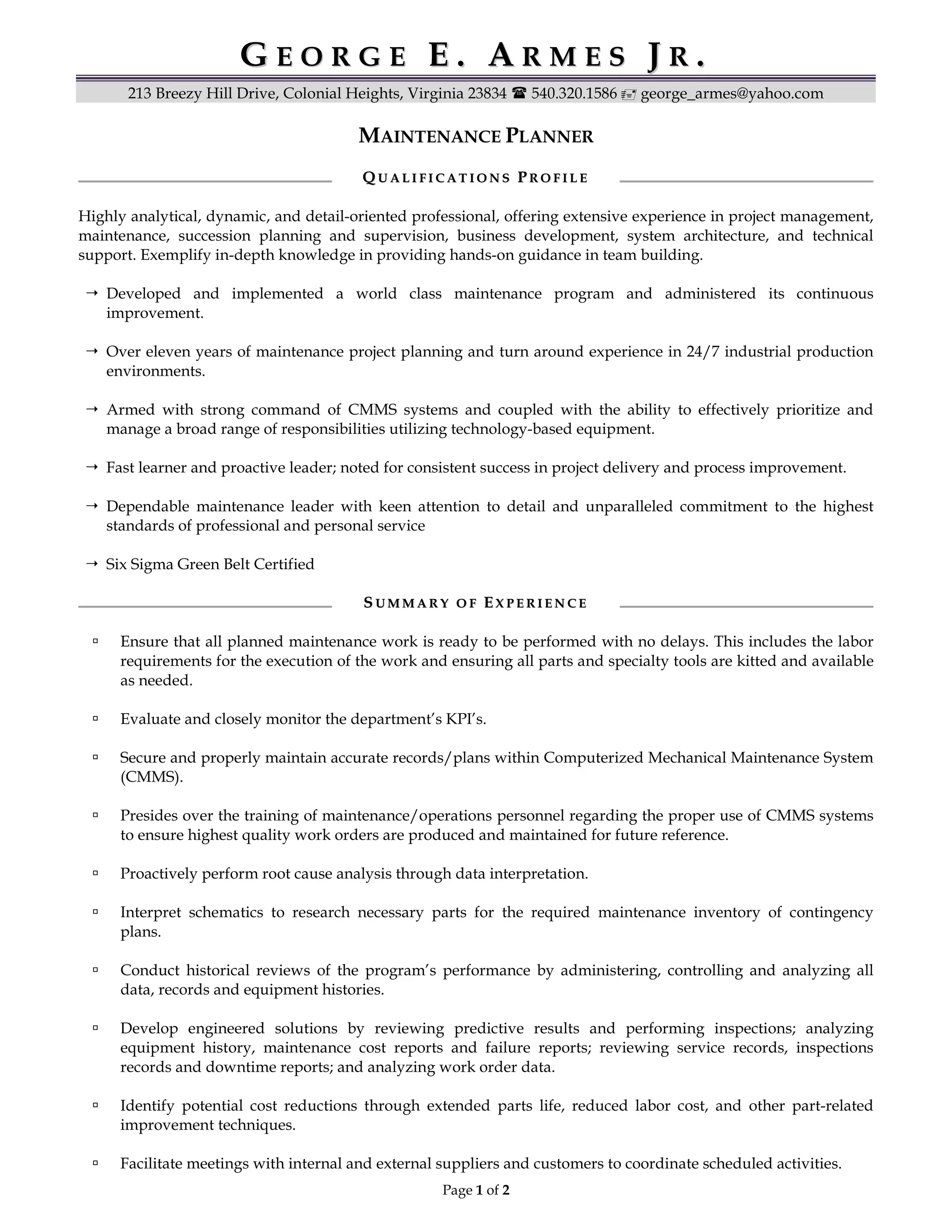 George Armes has over 11 years of experience in maintenance project planning and management in industrial environments. He is skilled in computerized maintenance management systems and uses data to analyze equipment performance and identify process improvements. His responsibilities include ensuring maintenance work is planned and resourced, evaluating key performance indicators, and managing maintenance costs. He aims to maximize efficiency and minimize downtime through root cause analysis, predictive maintenance, and engineered solutions.
