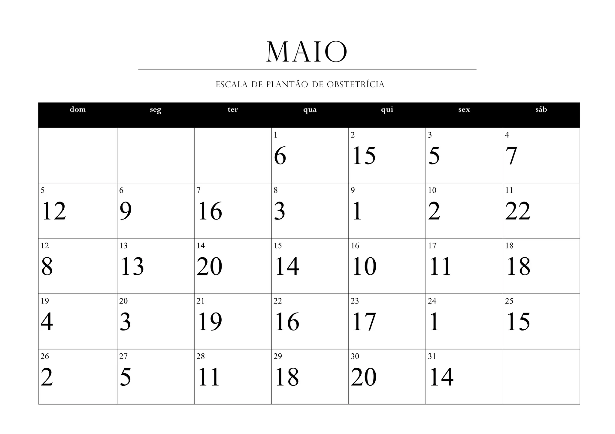 ESCALA DE PLANTÃO DE OBSTETRÍCIA dom seg ter qua qui sex sáb 1 2 3 4 6 15 5 7 5 6 7 8 9 10 11 12 9 16 3 1 2 22 12 13 14 15 16 17 18 8 13 20 14 10 11 18 19 20 21 22 23 24 25 4 3 19 16 17 1 15 26 27 28 29 30 31 2 5 11 18 20 14