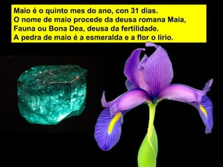 A pedra de maio é a esmeralda e a flor o lirio.