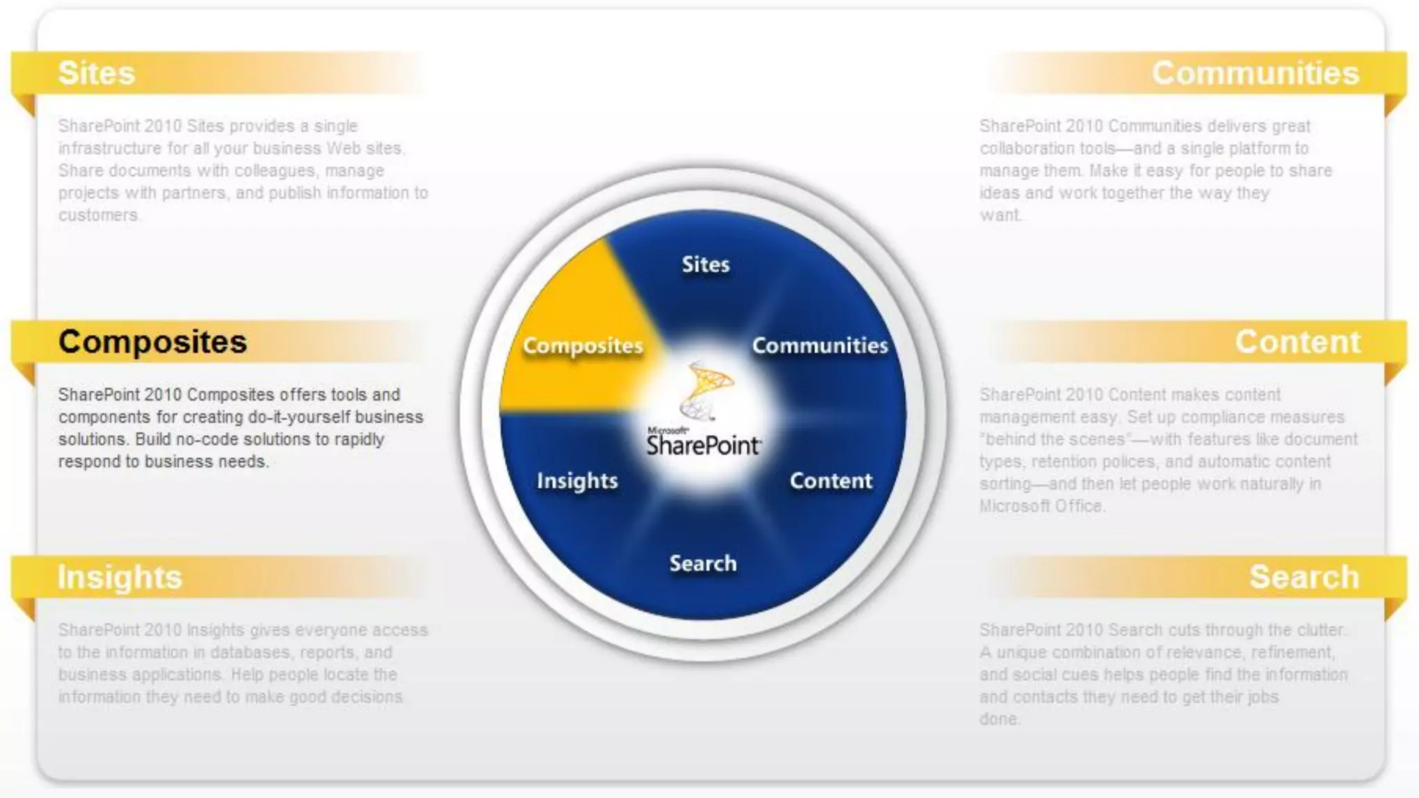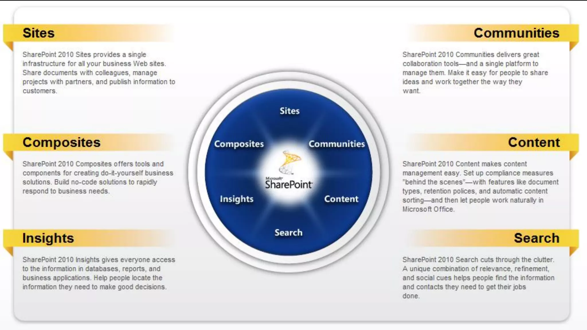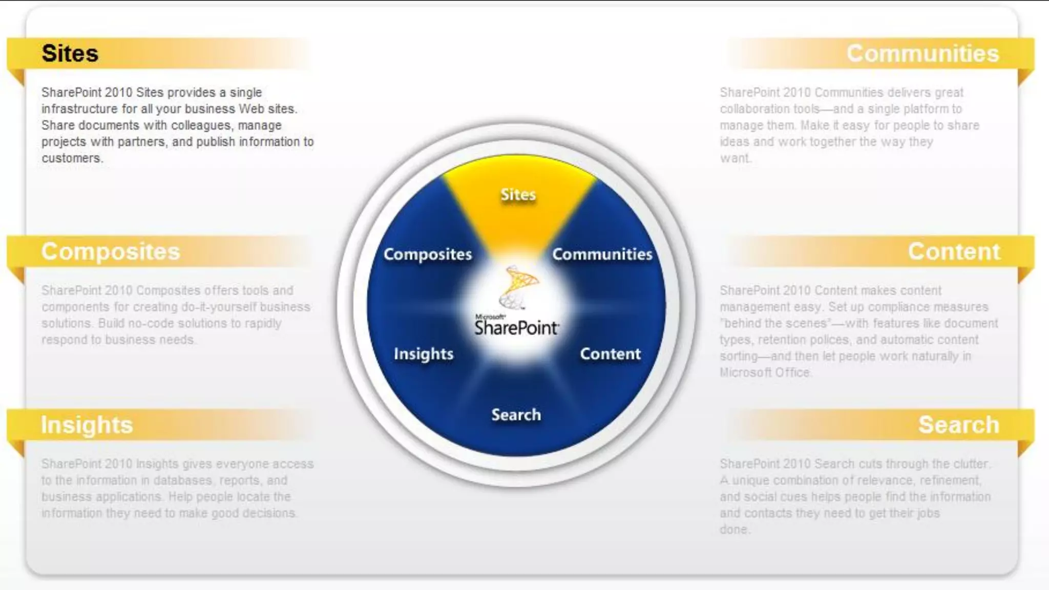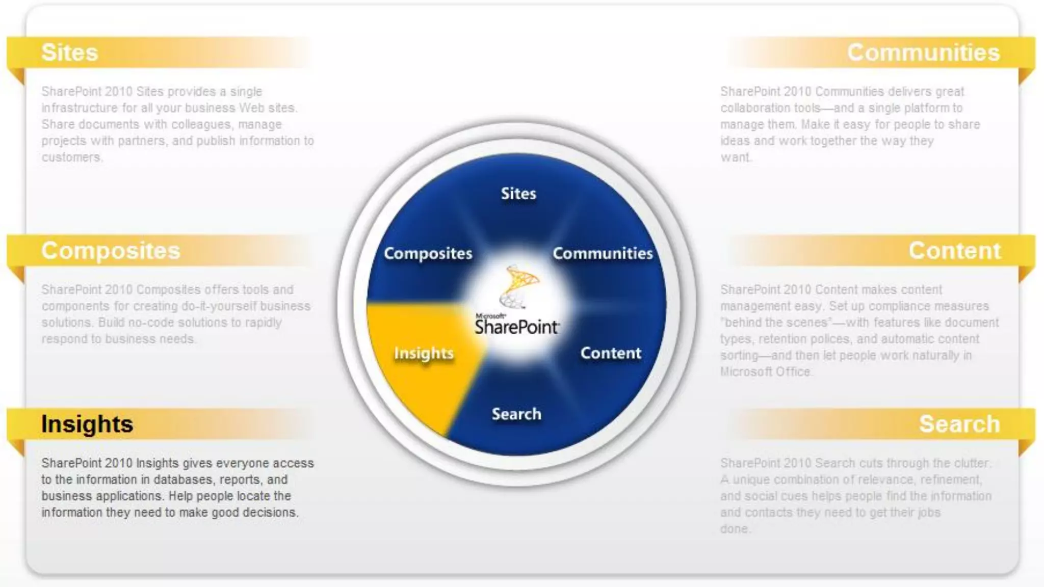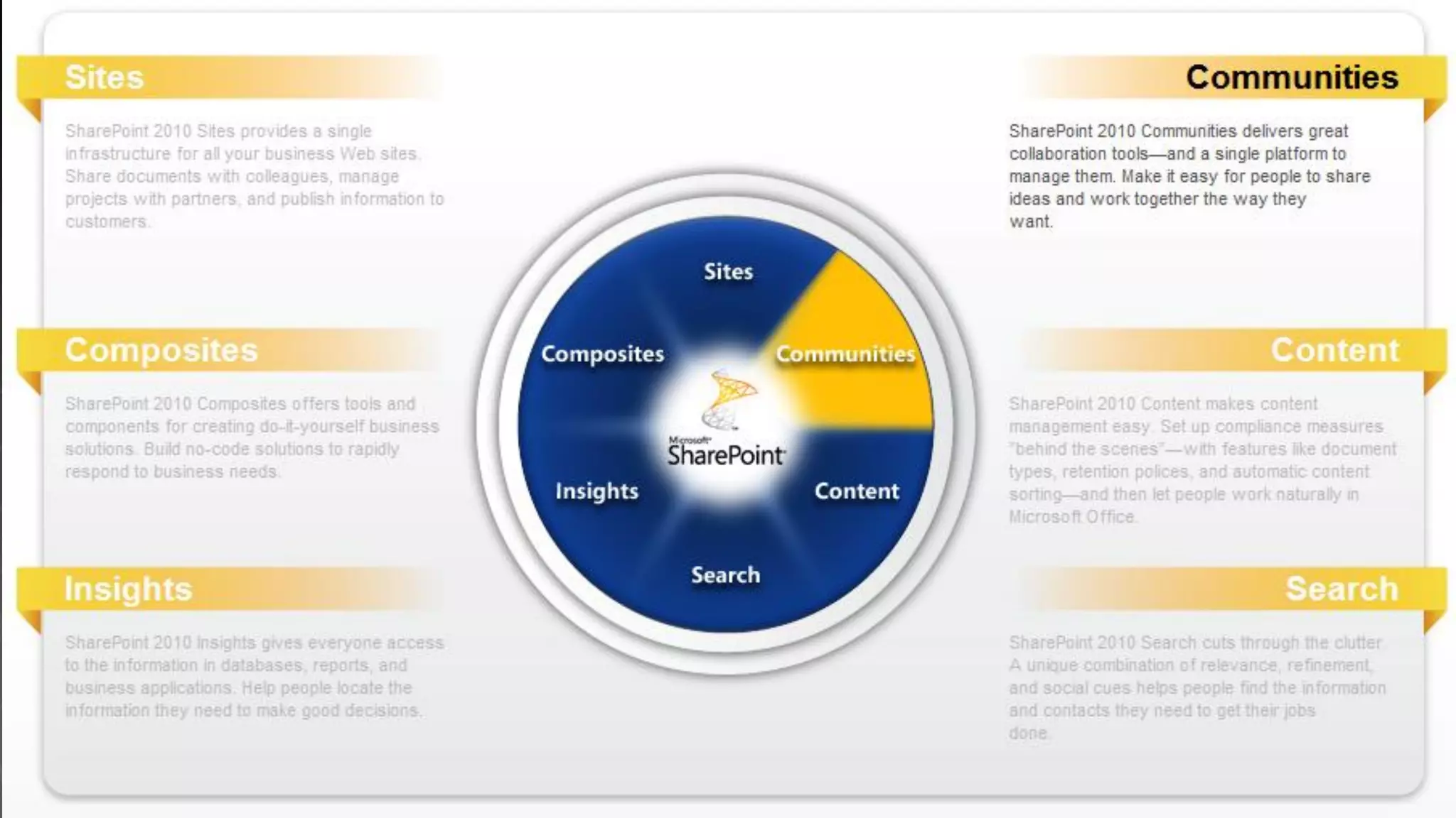 SharePoint 2010 is a web-based collaboration platform that allows users to share and organize documents, ideas, contacts and access them from anywhere. It provides shared workspaces to store and access documents and information for teams and projects. Users can synchronize documents offline for mobile access and resolve editing conflicts through a merge engine. Third party providers can deploy web parts, workflows and other features to extend SharePoint's capabilities. Code is isolated for security and scalability.