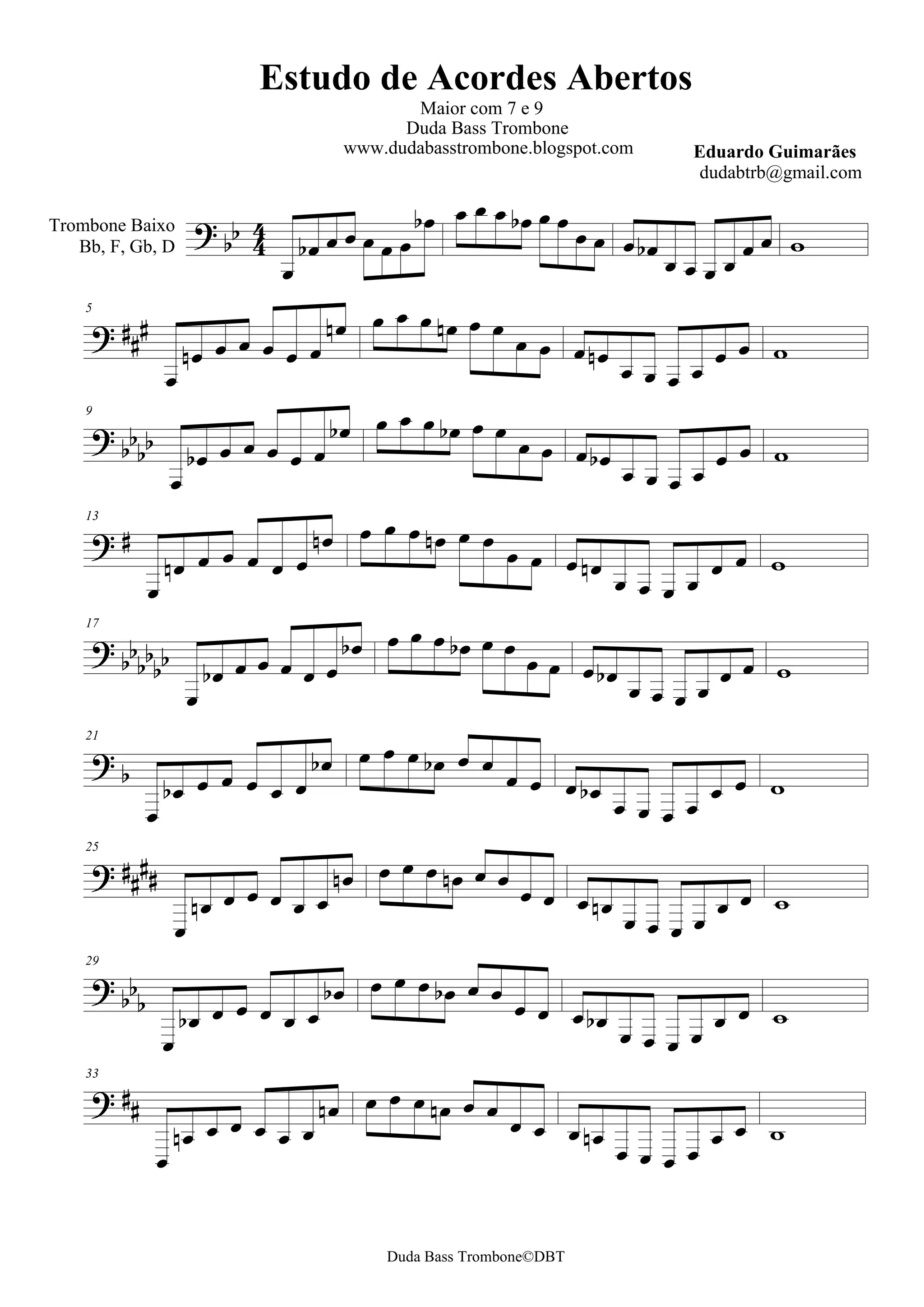 This document contains musical notation for an open chord study for bass trombone in major keys with 7th and 9th extensions. It consists of 34 lines of musical staff notation showing chord progressions using open chords and their extensions built on the notes Bb, F, Gb, and D. The document is authored by Duda Bass Trombone and provides contact information.