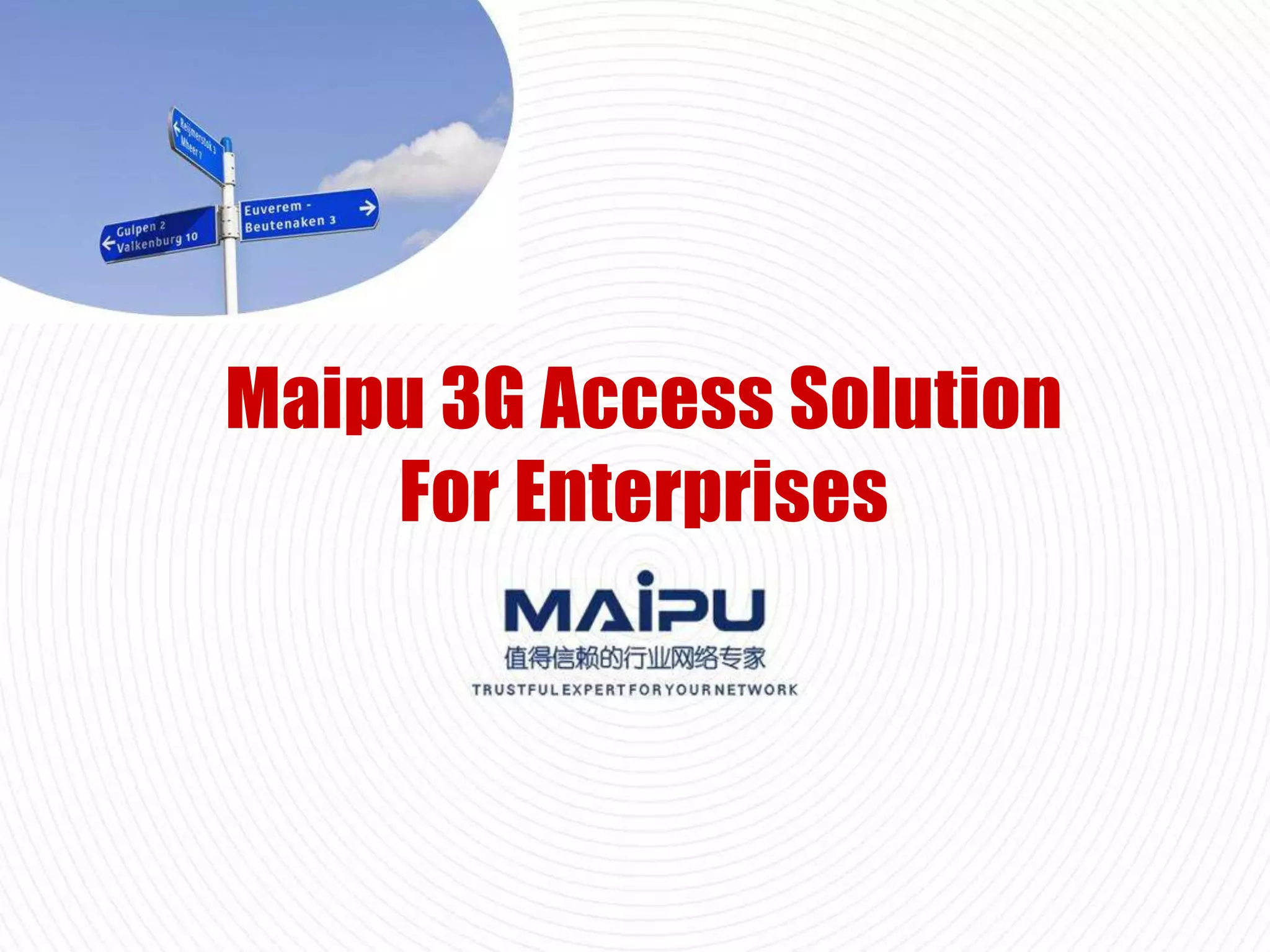 This document discusses Maipu's 3G access solution for enterprises. It outlines the network requirements of various industries including financial services, police, transportation, power, and retailers. It then describes how Maipu's 3G solution provides flexibility, reliability, security, and easy management through features like dual 3G modules, external antennas, SMS management, remote management, and locating/tracking via an E3G management platform. The document also introduces Maipu's MP1800 router series which supports various interfaces and modules. It concludes with an overview of Maipu's customer base utilizing their 3G and E3G solutions across China.