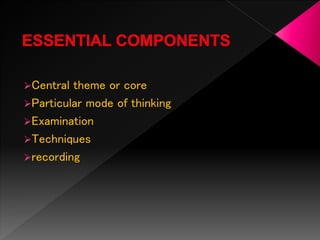This document discusses principles and techniques for manual therapy examinations and treatments. It describes the central themes of listening to the patient, understanding verbal and non-verbal communication, and building trust. It emphasizes keeping theoretical knowledge separate from clinical evidence when examining patients. Examination techniques discussed include range of motion tests, accessory movements, and compression tests to identify pain sources. Treatment techniques focus on physiological and accessory movements at varying amplitudes, ranges, and force levels to address pain, stiffness, and spasms. The importance of ongoing assessment and modifying techniques based on a patient's response is stressed.