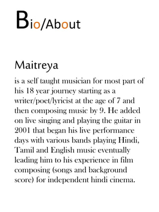 Maitreya is a self-taught Indian musician who began writing poetry and lyrics at age 7 and composing music at age 9. Over the past 18 years, he has performed live Hindi, Tamil, and English music with various bands and has composed music for independent Hindi films. Some of his albums include Revolution (2013), Jaago Hindustan (2014), and Dynamic Love (2016). He has over 70 live show performances in South India between 2002-2012 singing his own compositions as well as covers of Indian and Western artists.