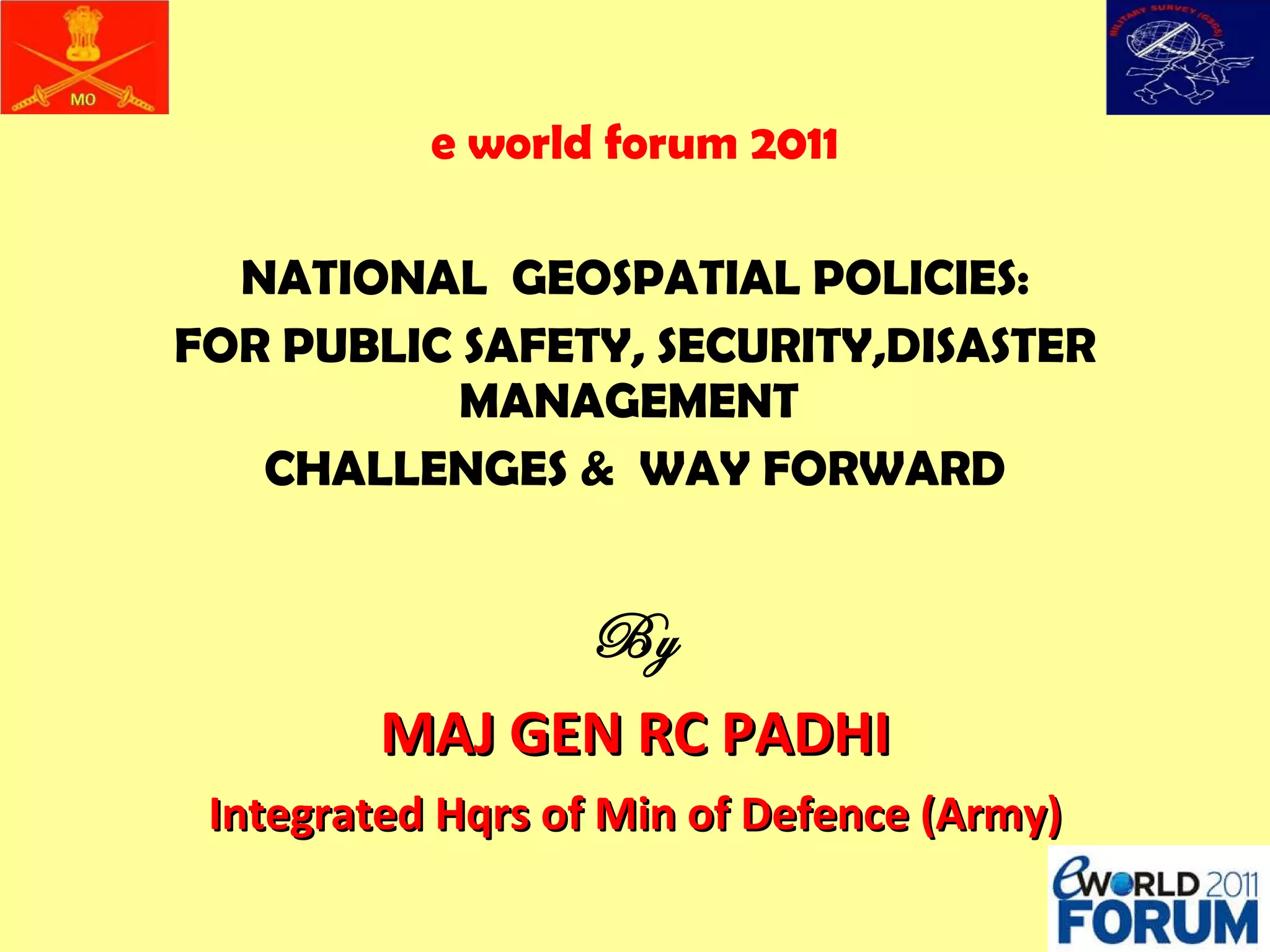 The document outlines India's national geospatial policies regarding public safety, security, and disaster management, emphasizing the strategic need for liberalizing access to spatial data while ensuring national security. It details various aspects of mapping policies, remote sensing data, and aerial photography, highlighting the balancing act between facilitating development and protecting sensitive information. The text concludes with recommendations for further liberalization and collaboration with the geospatial industry to enhance capabilities while changing perceptions of geospatial data from a security threat to a development tool.