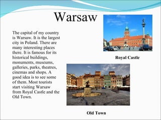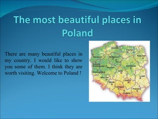 The document introduces several beautiful places to visit in Poland, including its capital Warsaw with its historical buildings, royal castle, and old town; the port city of Gdańsk on the Baltic Sea known for Neptune's Fountain and Westerplatte; and the oldest city of Cracow located on the Vistula River and home to Wawel Castle, Sukiennice, and St. Mary's Basilica. It also mentions the winter sports town of Zakopane in the Tatra Mountains and the Polish ski jumping champion Adam Małysz. The author hopes the reader will visit these sites on a trip to Poland.