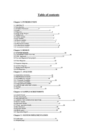 This document provides an overview of an online hospital management system project. It includes an abstract, introduction, problem statement, goals, objectives, scope, and modules. The main modules are the admin, user, doctor, nurse, pharmacist, laboratorist, and accountant modules. It also covers the system design using UML diagrams including use case diagrams, class diagrams, sequence diagrams, activity diagrams, and deployment diagrams. It discusses the existing system, proposed system, and feasibility study. Finally, it provides screenshots of sample pages and discusses implementing the system using technologies like HTML, PHP, and MySQL.