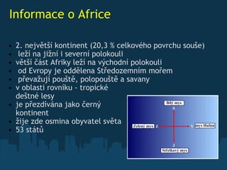 Informace oAfrice 2. největší kontinent (20,3 % celkového povrchu souše) leží na jižní i severní polokouli větší část Afriky leží na východní polokouli od Evropy je oddělena Středozemním mořem převažují pouště, polopouště a savany v oblasti rovníku - tropické deštné lesy je přezdívána jako černý kontinent žije zde osmina obyvatel světa 53 států