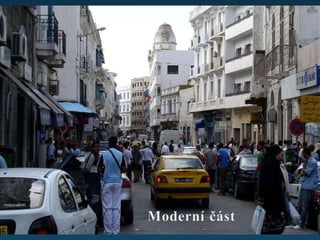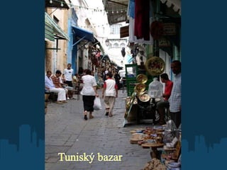 Tunis - obyvatelstvo: 1 200 000 (60 x více než v Lounech) - je hlavním městem Tuniska - leží na severozápadním pobřeží Tuniska - je jedním z nejstarších měst na Zemi - nejvyšší bod města leží ve výšce 150 m n. m - nadmořská výška se pohybuje okolo 3 metrů - ve 2. století př. n. l. zde vzniklo opevnění - dělí se na několik částí: medinu (staré město) - byla založena za vlády Arabů – v 8. století. Najdeme tu úzké uličky, mešity a paláce středověké čtvrtě (suky) – části města , kde najdeme trhy a na nich veškeré harampádí obrovská moderní předměstí - hlavní částí je bulvár Habiba Bourguiby, který se sice oficiálně jmenuje bulvár 7. listopadu, ale říká se mu po Habibovi. Je to takový jejich Václavák, místo koně mají sochu Ibn Chaldúna. Bulvár vede od přístavu ke starému městu. Přístav