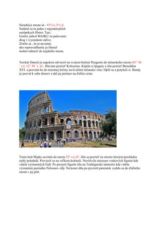 ´ s.š; 12° 30´ v. d) . Išla tam pozrieť Koloseum. Kúpila si špagety a išla pozrieť Benedikta