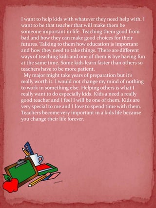 The document discusses the author's choice to major in teaching. The author has always enjoyed interacting with and caring for children, both at their church and elsewhere. They were inspired by their kindergarten teacher, Mrs. Mena, who helped them learn English and do well in school. The author wants to help children in any way needed, guide them to make good choices, and teach in a fun way so all students can learn. While their major will require years of preparation, the author is committed to becoming a teacher to help others, especially children, who they feel are very special.
