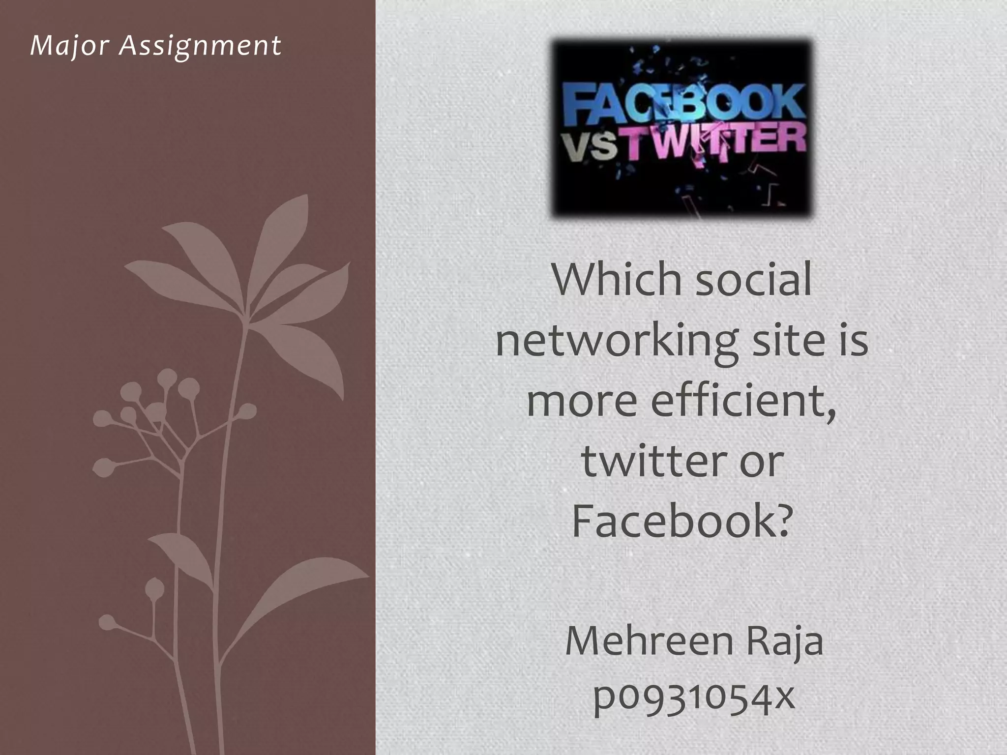 The document summarizes a presentation comparing the social networking sites Facebook and Twitter. It discusses key differences such as Facebook focusing on connections with friends and family while Twitter emphasizes sharing brief updates. A questionnaire found that most respondents preferred Facebook as they saw it as easier to use and a way to interact with real-life connections rather than more casual contacts on Twitter. While both sites have their pros and cons, the conclusion is that based on the research, Facebook is deemed a more efficient social networking site.
