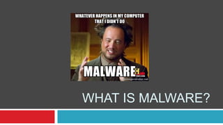 The document explains various types of malware, including adware, spyware, ransomware, bots, bugs, and viruses, detailing their functions and the potential risks they pose. It also provides protective measures against malware, such as being cautious with unfamiliar files and only downloading from reliable sources. Additionally, it recommends Malwarebytes Anti-Malware as a powerful tool for protection.
