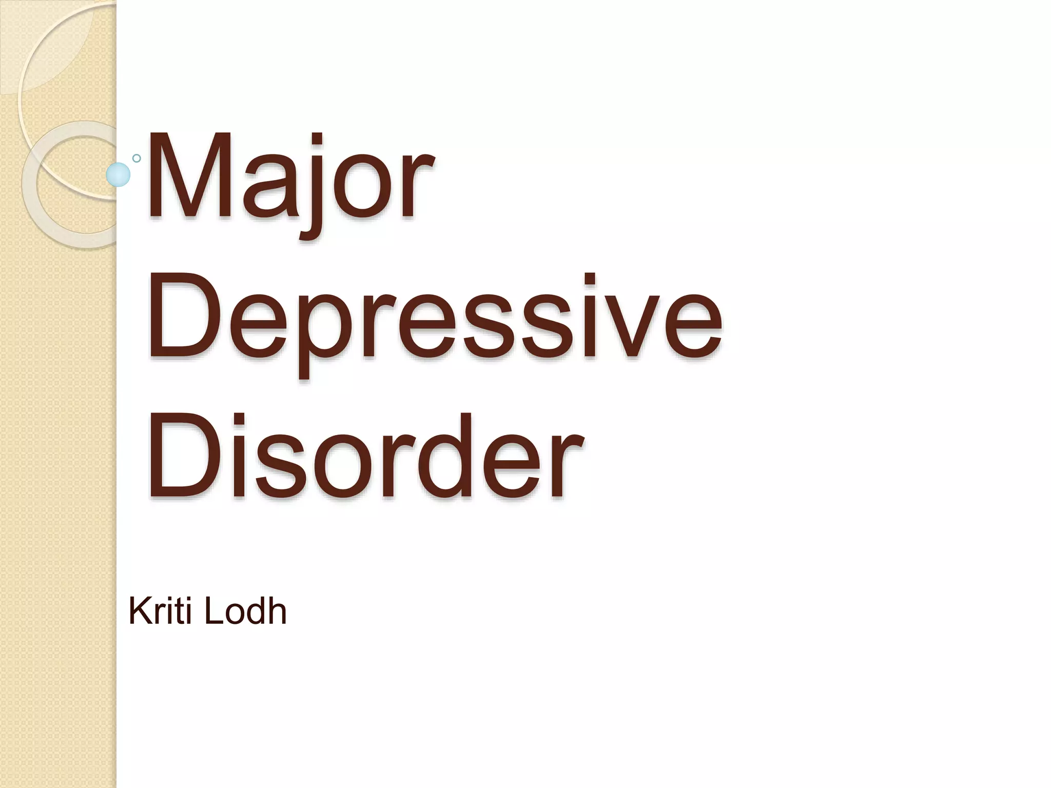 Major depressive disorder is a serious mood disorder characterized by depressed mood or loss of interest lasting at least two weeks. It affects up to 21% of women and 13% of men at some point in their lives, typically beginning in the 20s. Symptoms include depressed mood, loss of interest, changes in sleep, energy, appetite, concentration and thoughts of death or suicide. Major depression is more common in women during times of hormonal changes like puberty, pregnancy, and menopause. Men may be less likely to recognize signs of depression and seek help. Life changes and chronic stress can also trigger depressive episodes.