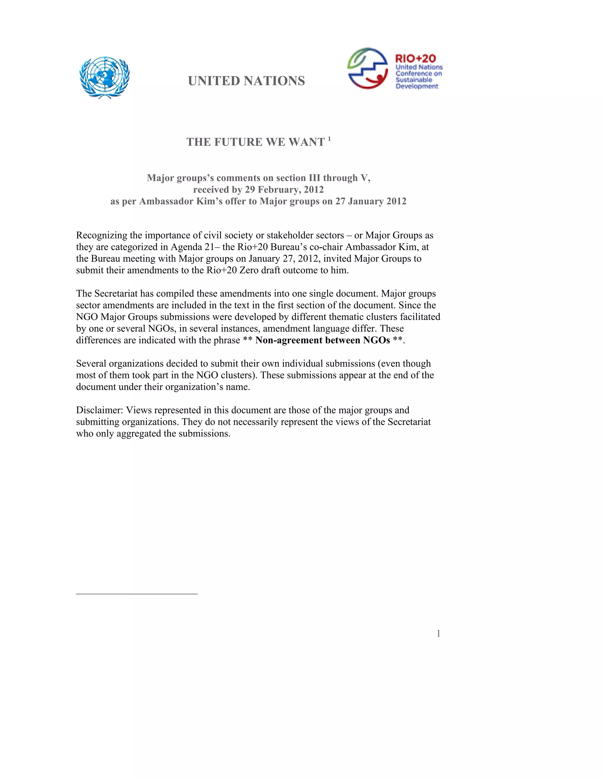 This document provides major groups' comments and proposed amendments to sections III through V of the Rio+20 Zero draft outcome document. It includes proposed amendments submitted by major groups to the Rio+20 Bureau by February 29, 2012.