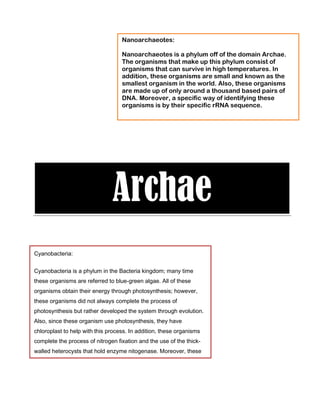 - Cyanobacteria perform photosynthesis and nitrogen fixation and are diverse.