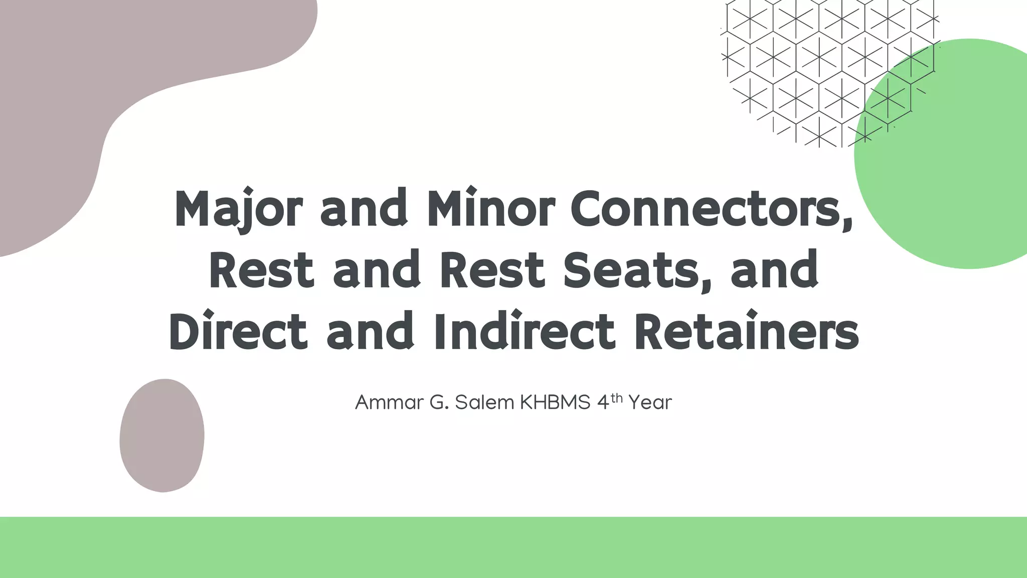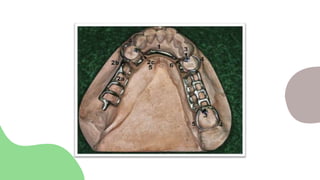 Major connectors unite the major parts of the denture framework and provide cross-arch stability. Minor connectors connect the major connector to other framework components to transfer stresses. Rests and rest seats provide vertical support on tooth surfaces. Direct retainers resist movement away from teeth, while indirect retainers provide retention for distal extension bases when dislodged from their seats. Key considerations in design include rigidity, contour, avoidance of impingement, and ensuring proper cleansing access.