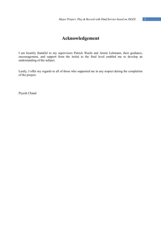 The document is a major project report on developing a Play & Record with Dtmf service based on JSLEE. It includes an acknowledgment section and outlines the following contents: project goal, structure of the report, theoretical basis on JSLEE, Convedia Media Server 3000, MSML and control channels, the used practical framework, the developed service including functionality and library development/integration, and a conclusion.