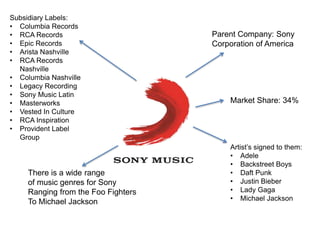 Sony Corporation of America is a major record label with a 34% market share. It has many subsidiary labels covering a wide range of genres and artists such as Adele, Backstreet Boys, Daft Punk, Justin Bieber, Lady Gaga, and Michael Jackson. Universal Music Group is the largest music recording company in the world with a 37% market share. It has labels like Interscope Geffen A&M, Island Records, and Republic Records, and artists like Katy Perry, Kanye West, Nicki Minaja, and Selena Gomez. Warner Music Group has a 19% market share and labels including Atlantic Records, Roadrunner Records, and Reprise Records, with artists like Jason Der