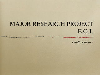 This document outlines a major research project to redesign a public library. It identifies key research questions around making the library more social, attracting new users while keeping current ones, and transforming the infrastructure. Goals include making the library more accessible, attractive to wider demographics, adding elements of play and technology, and updating the culture. Barriers include funding, outdated facilities, and trying to appeal to different groups. The document provides inspiration from innovative libraries and outlines stakeholders, issues, and potential sources.