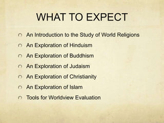 This document provides an overview of world religions, beginning with an introduction. It then discusses Hinduism in depth, covering its origins, scriptures like the Vedas and Upanishads, concepts like samsara and karma, major texts like the Ramayana and Bhagavad Gita. It also explains the caste system, yoga, and popular Hindu deities. The document then summarizes Buddhism, including the life of Siddhartha Gautama and how he was raised in luxury but driven to enlightenment by witnessing human suffering.