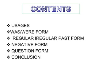This document discusses the past simple tense in English. It covers the usage of was/were forms, regular and irregular past forms, negative and question forms. It provides examples for each. Key points include: the past simple expresses completed actions at a specific time in the past or a habit that is no longer true. It lists regular verb conjugations and spelling rules for adding -ed. The conclusion states the past simple is used for a series of completed past actions or a single finished action.