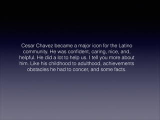 Cesar Chavez was a major icon for the Latino community who worked to help farm workers' rights. He was born in 1927 in California and had to quit school at a young age to work to support his family. As an adult, he co-founded the National Farm Workers Association and helped organize farm workers to fight for better wages and working conditions. Through non-violent protests and strikes, he was eventually able to force growers to recognize the union. Cesar Chavez overcame many obstacles and is remembered today through a holiday in several states that honors his work advocating for civil rights and social justice.