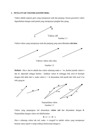 Dokumen ini membahas konsep dasar aljabar linier vektor pada ruang berdimensi 2 dan 3, termasuk definisi, operasi penjumlahan, pengurangan, dan perkalian skalar vektor. Selain itu, dijelaskan juga tentang norma vektor serta sifat-sifat aritmatika vektor yang penting dalam penghitungan. Contoh-contoh matematis disertakan untuk memperjelas aplikasi konsep-konsep tersebut.