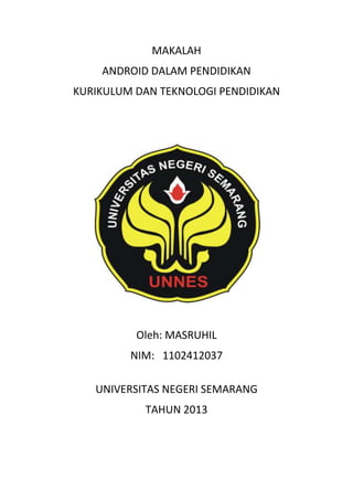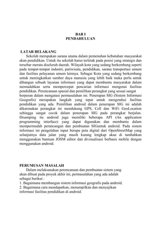 Makalah ini membahas tentang penerapan sistem informasi geografis berbasis Android untuk menyediakan informasi fasilitas pendidikan. Sistem ini akan menampilkan peta digital dari OpenStreetMap dan menambahkan data jalan yang kurang lengkap menggunakan editor JOSM. Sistem ini bertujuan untuk memudahkan masyarakat mencari informasi fasilitas pendidikan dengan menggunakan perangkat bergerak.