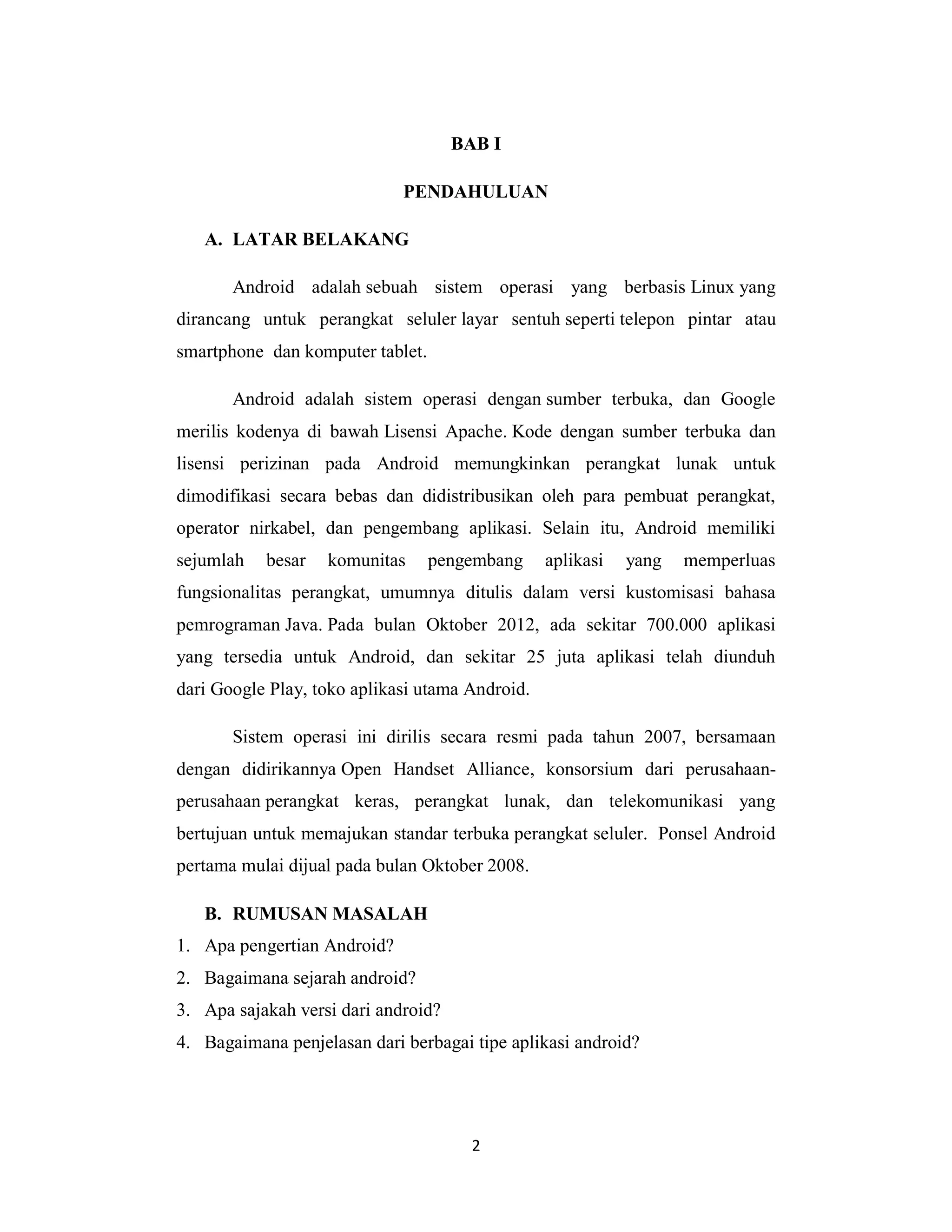 Dokumen ini membahas tentang sistem operasi Android, yang dibangun di atas kernel Linux dan ditujukan untuk perangkat seluler seperti smartphone dan tablet. Dengan sifat sumber terbuka, Android memungkinkan pengembang untuk memodifikasi dan mendistribusikan perangkat lunak, menghasilkan hampir 700.000 aplikasi hingga 2012. Android juga mengalami perkembangan yang signifikan dari peluncurannya pada tahun 2007 hingga menjadi sistem operasi terpopuler di dunia pada tahun 2013.