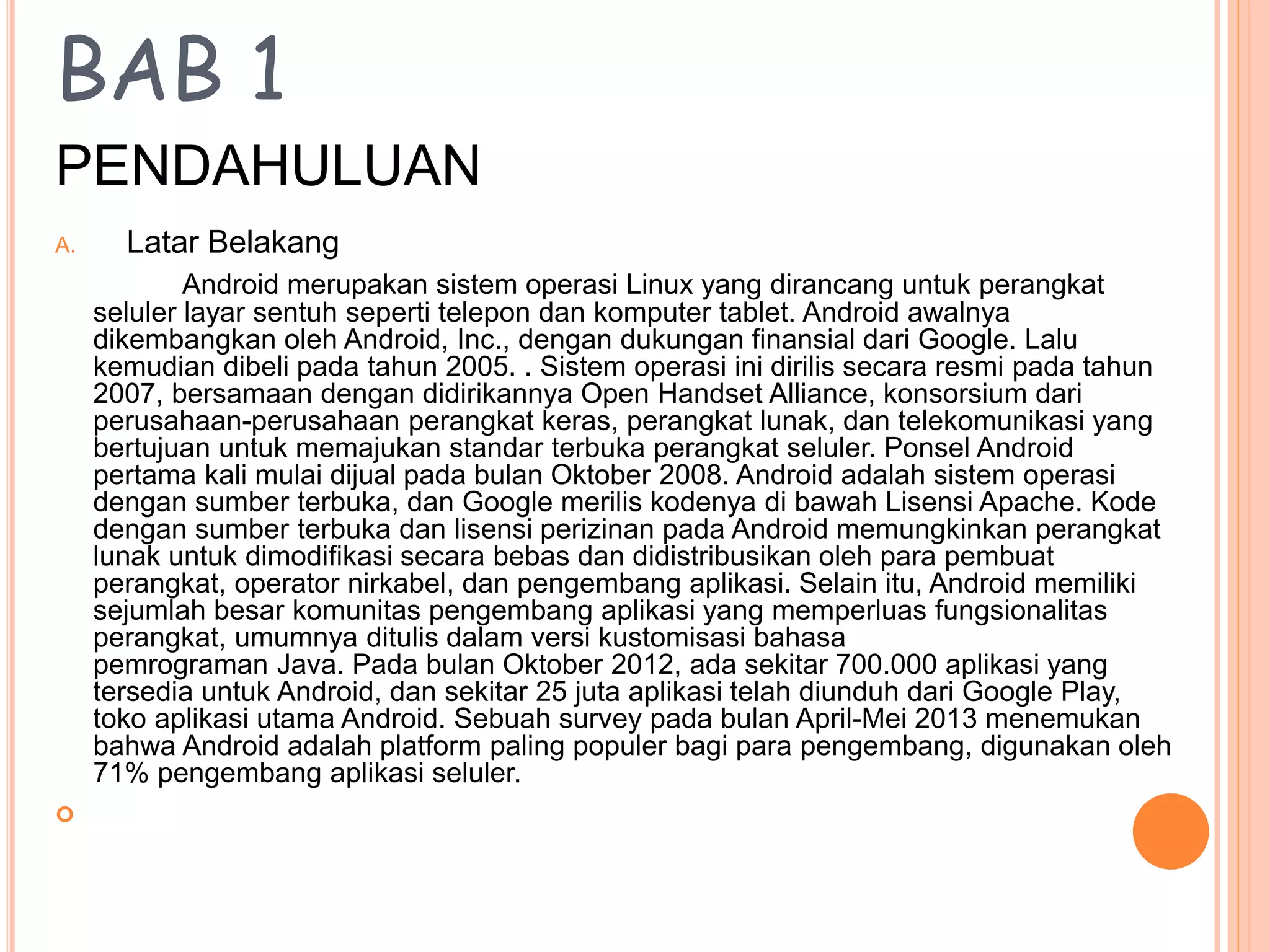 Dokumen ini membahas sejarah, deskripsi, dan pengembangan sistem operasi Android, yang dirancang untuk perangkat seluler dan berbasis Linux. Android pertama kali dirilis oleh Google pada tahun 2007 dan sejak itu telah menjadi platform paling populer bagi pengembang aplikasi seluler, dengan lebih dari 700.000 aplikasi tersedia di Google Play pada tahun 2012. Selain itu, dokumen ini juga menyoroti tantangan yang dihadapi Android terkait pembaruan perangkat dan dukungan dari produsen.