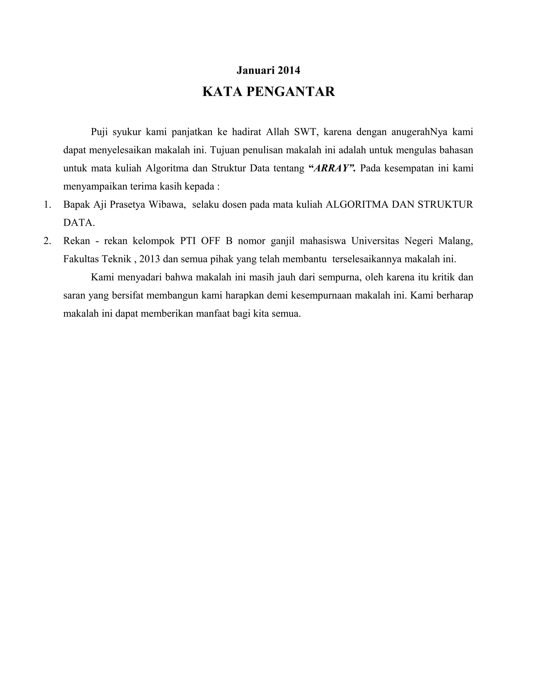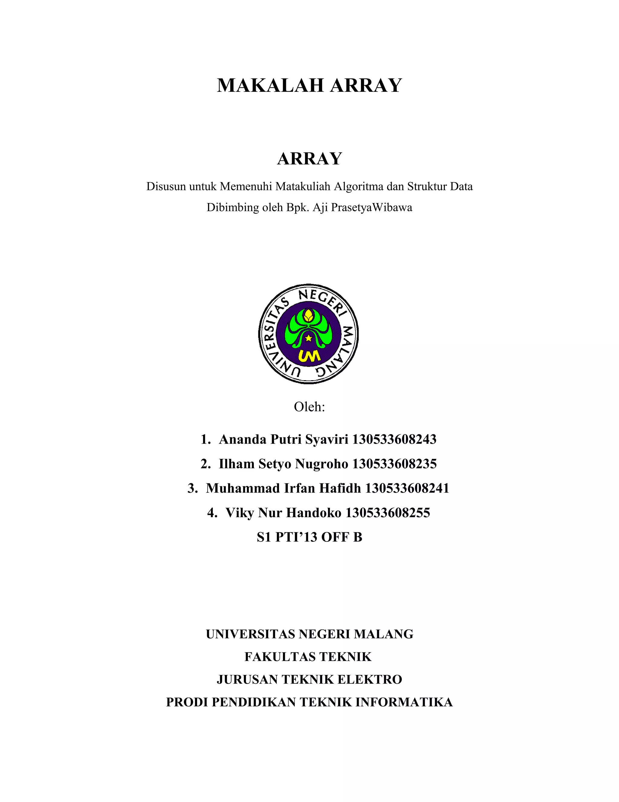 Makalah ini membahas tentang array dalam konteks algoritma dan struktur data sebagai bagian penting dari pendidikan teknik informatika. Array adalah struktur data yang menyimpan data bertipe sama dan dibagi menjadi tiga jenis: satu dimensi, dua dimensi, dan multidimensi. Tujuan penulisan makalah ini adalah untuk membantu mahasiswa memahami konsep dan penerapan array secara efektif.