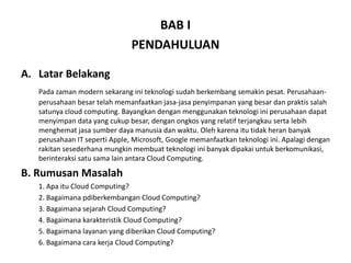 Makalah ini membahas tentang cloud computing, teknologi penyimpanan data yang semakin populer dan praktis digunakan oleh perusahaan besar. Penjelasan mencakup definisi, karakteristik, layanan, dan manfaat cloud computing serta perkembangan teknologinya di era modern. Tujuan makalah ini adalah untuk memperkenalkan dan menjelaskan pemahaman tentang cloud computing kepada pembaca.