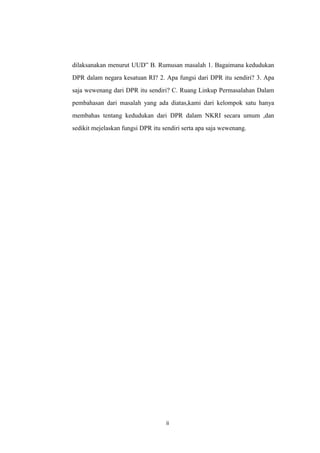 Dokumen tersebut membahas tentang kedudukan, fungsi, dan wewenang DPR dalam sistem ketatanegaraan Indonesia. Secara ringkas: