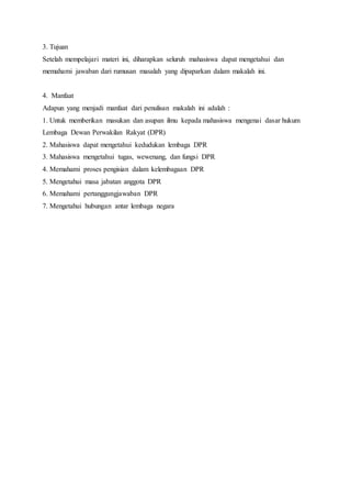 Makalah ini membahas peran dan fungsi Dewan Perwakilan Rakyat (DPR) dalam sistem demokrasi di Indonesia, termasuk dasar hukum, kedudukan, dan tanggung jawabnya. Setelah amandemen UUD 1945, DPR memiliki kekuasaan legislatif untuk membentuk undang-undang serta fungsi anggaran dan pengawasan. Pemahaman terhadap lembaga DPR diharapkan dapat memberikan wawasan kepada mahasiswa mengenai pentingnya institusi ini dalam mewakili aspirasi rakyat.