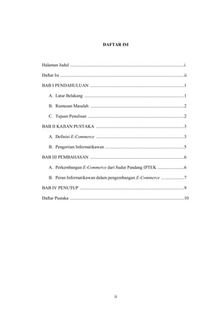 Dokumen ini membahas e-commerce, pengetahuan informatikawan, dan perkembangan teknologi informasi yang mendukung transaksi elektronik. Juga dijelaskan tentang peran informatikawan dalam pengembangan sistem e-commerce yang aman dan efisien. Kesimpulannya, informatikawan sangat penting dalam meningkatkan efektivitas dan efisiensi e-commerce di era digital.