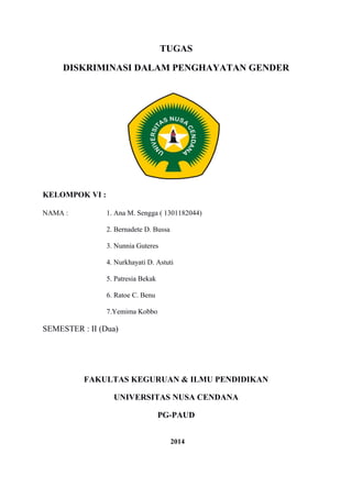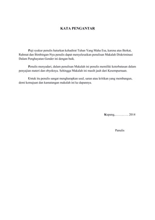 Makalah ini membahas diskriminasi gender, termasuk pengertian, bentuk, faktor penyebab, dampak, dan cara memperjuangkan kesetaraan gender, serta menyoroti permasalahan serius seperti pemerkosaan dan berbagai bentuk kekerasan terhadap perempuan. Penulis mengidentifikasi berbagai bentuk diskriminasi seperti marginalisasi, sub ordinasi, stereotype, dan kekerasan, serta faktor budaya patriarkhi yang mempengaruhi ketidaksetaraan gender. Tujuan dari makalah ini adalah untuk memberikan pemahaman yang lebih baik mengenai diskriminasi gender dan harapan untuk membantu perempuan menghadapi tantangan ini.