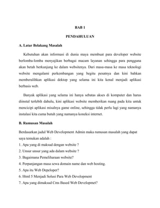 Dokumen ini membahas perkembangan HTML5 dalam konteks pengembangan web dan pendidikan teknologi. Dijelaskan mengenai elemen dasar website, pemeliharaan, serta pentingnya domain name, web hosting, dan peran web developer. HTML5 diidentifikasi sebagai solusi untuk membuat aplikasi web yang dinamis dengan menambahkan berbagai elemen dan atribut baru untuk meningkatkan aksesibilitas dan struktur halaman.