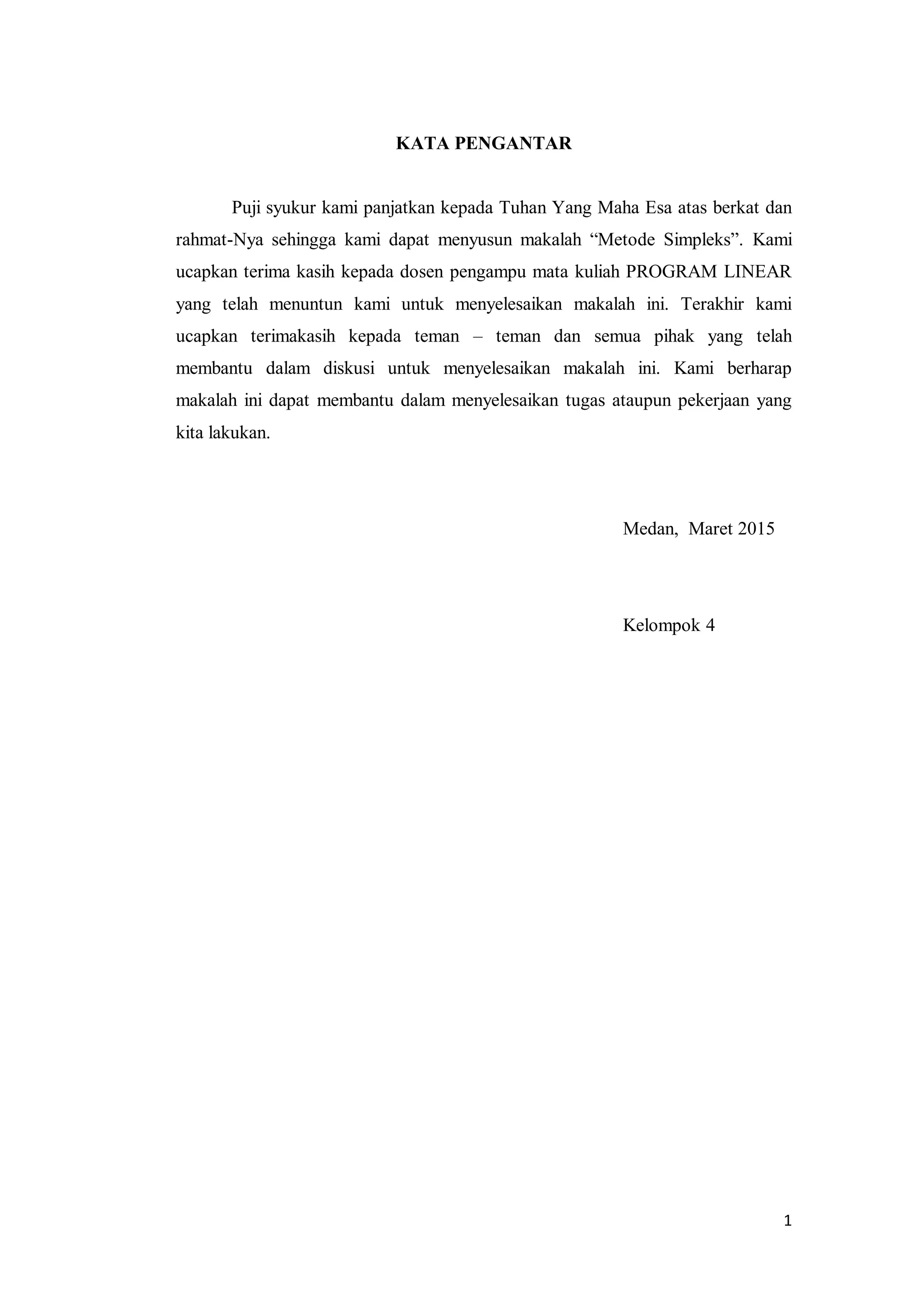 Dokumen ini adalah makalah tentang metode simpleks dalam pemrograman linear yang disusun oleh kelompok 4 dari Universitas Negeri Medan. Makalah ini menjelaskan konsep dasar pemrograman linear, termasuk masalah maksimasi dan minimasi, serta langkah-langkah penggunaan metode simpleks untuk mencapai solusi optimal. Selain itu, dokumen ini juga membahas masalah yang terkait dengan kendala bertanda '=' serta metode penyelesaiannya.