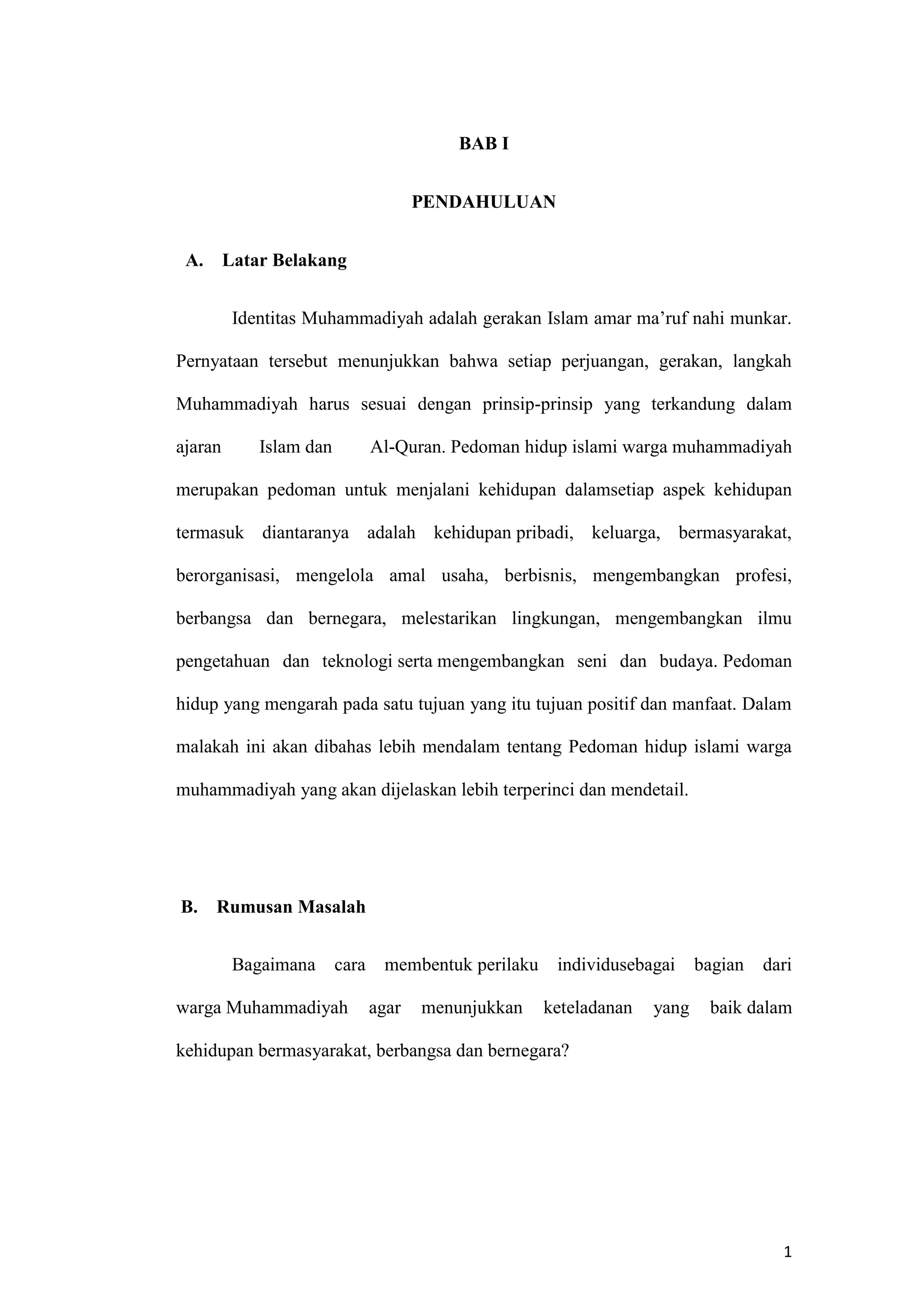 Dokumen ini membahas tentang pedoman hidup islami warga Muhammadiyah yang berlandaskan ajaran Al-Qur'an dan As-Sunnah, serta bagaimana menerapkannya dalam kehidupan sehari-hari. Tujuannya adalah untuk membentuk perilaku individu yang menunjukkan keteladanan dalam masyarakat, bangsa, dan negara. Selain itu, dokumen ini juga menekankan pentingnya pengelolaan amal usaha Muhammadiyah sebagai bagian dari dakwah dan tanggung jawab sosial.