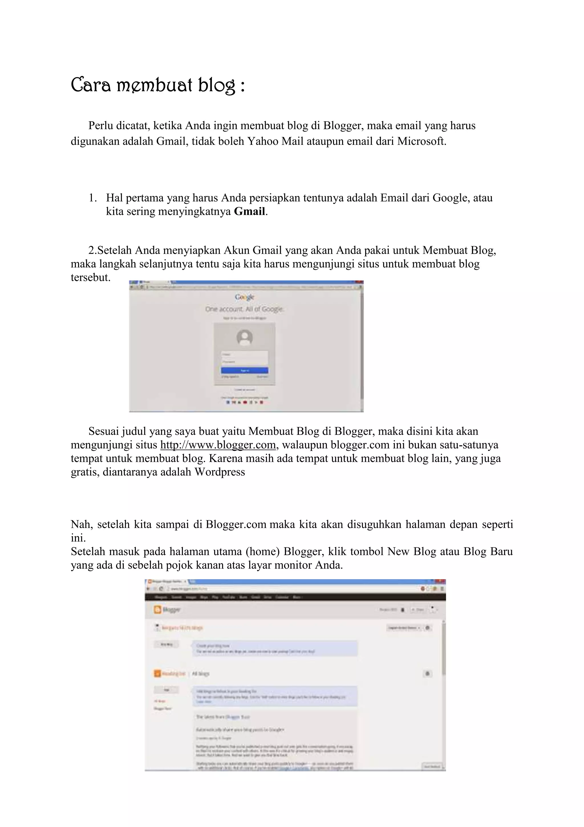 Dokumen ini menjelaskan cara membuat blog menggunakan Blogger dan WordPress, termasuk langkah-langkah pendaftaran dan pembuatan artikel. Kelebihan dan kekurangan kedua platform juga dibahas, seperti kemudahan penggunaan dan integrasi dengan layanan lain. Secara keseluruhan, informasi dalam dokumen ini sangat bermanfaat bagi pemula yang ingin memulai blogging.