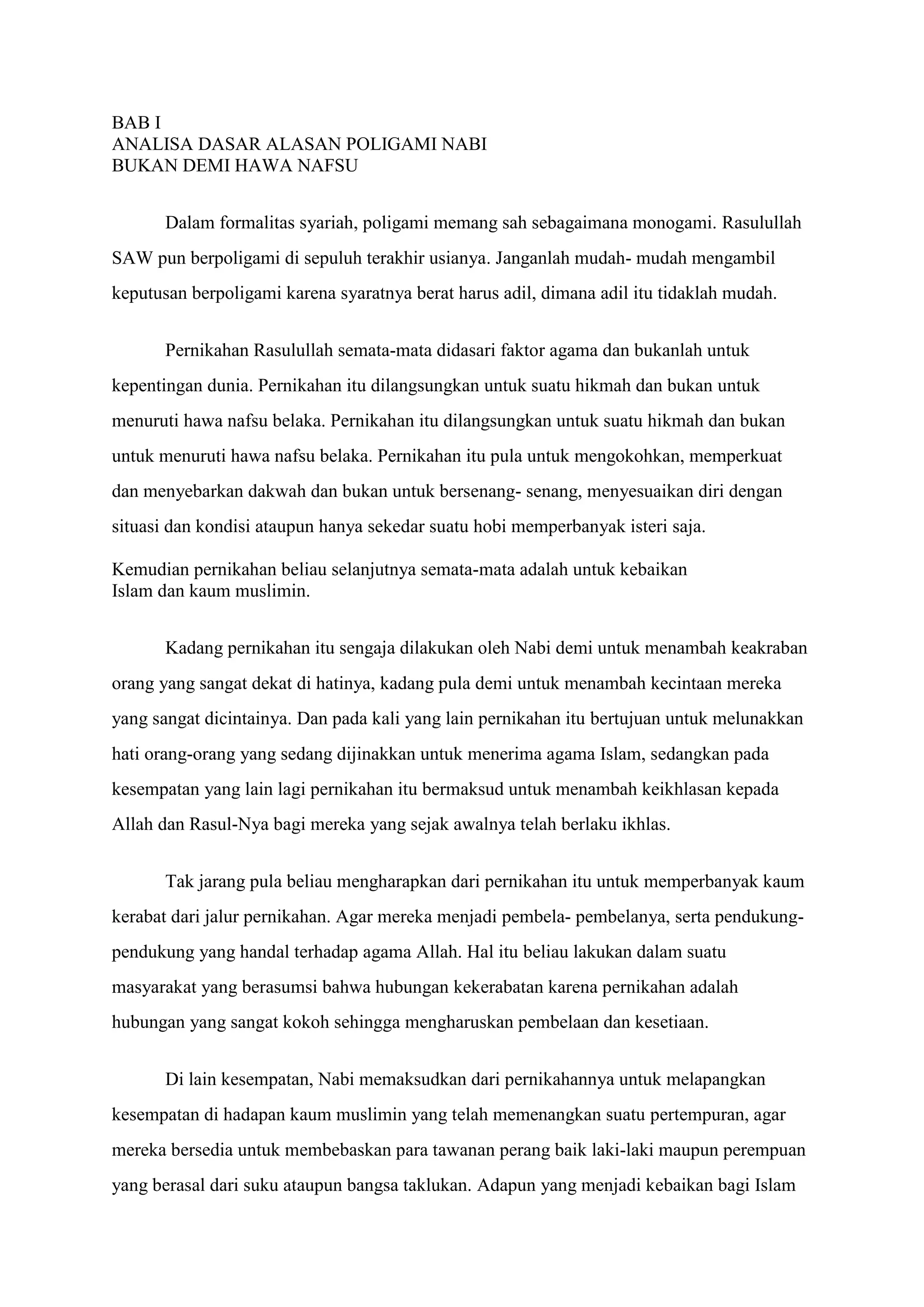 Teks tersebut membahas alasan-alasan poligami Nabi Muhammad SAW yang tidak semata-mata karena hawa nafsu melainkan untuk kebaikan Islam dan kaum muslimin. Isteri-isteri Nabi juga berperan penting dalam menyebarkan ajaran Islam melalui kesaksian mereka tentang akhlak dan amalan Nabi. Terdapat berbagai pendapat ulama tentang poligami, baik yang membolehkan maupun yang hanya dalam kondisi tertentu.