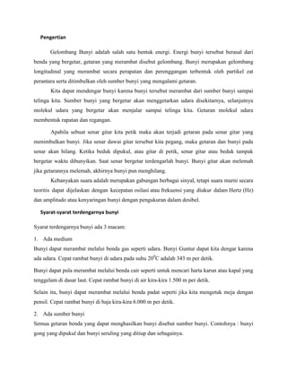 Dokumen ini membahas tentang gelombang bunyi sebagai bentuk energi yang dihasilkan dari getaran benda dan menjelaskan berbagai sifat dan karakteristik bunyi, termasuk cara perambatannya melalui medium serta faktor-faktor yang mempengaruhi kecepatan bunyi. Selain itu, dokumen ini juga mencakup manfaat dan aplikasi teknologi yang berhubungan dengan gelombang bunyi dalam kehidupan sehari-hari serta dalam bidang kedokteran. Bunyi dapat dibedakan berdasarkan frekuensinya menjadi infrasonik, audiosonik, dan ultrasonik.