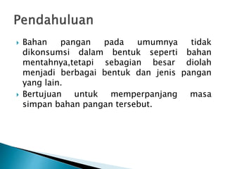 Dokumen tersebut membahas mengenai pengolahan dan pengawetan bahan pangan untuk memperpanjang masa simpannya sehingga kerusakan yang disebabkan oleh faktor fisik, kimia, dan mikrobiologi dapat dicegah. Bahan pangan umumnya diolah dan diolah untuk mengubah bentuk aslinya agar tahan lama. Karbohidrat merupakan komponen utama bahan pangan yang terdiri dari berbagai jenis seperti monosakarida, dis