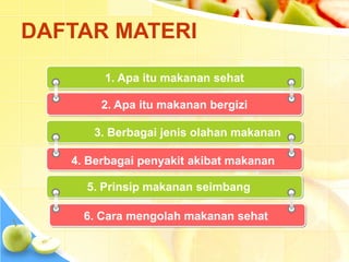 Dokumen ini membahas konsep makanan sehat dan bergizi, serta pentingnya zat gizi seperti karbohidrat, protein, lemak, vitamin, dan mineral untuk kesehatan tubuh. Selain itu, dijelaskan berbagai cara mengolah makanan dan jenis olahan pangan yang aman dan bergizi, serta risiko penyakit yang dapat muncul akibat konsumsi makanan tidak sehat. Akhirnya, diperkenalkan prinsip gizi seimbang dan cara menjaga kualitas gizi dalam pengolahan makanan.