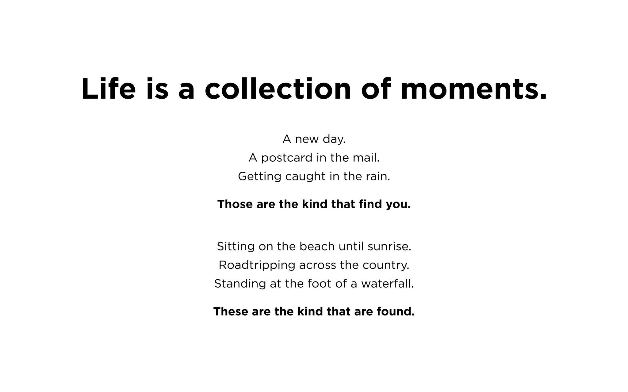 This document discusses the value of life's meaningful moments and experiences. It argues that people should seek out experiences that excite their senses and satisfy their hearts. While technology allows people to witness many events, it risks making extraordinary moments seem ordinary. The document encourages reminding people that life's ordinary moments can make extraordinary ones more memorable, and that even routine activities can be meaningful with daring and boldness. It presents the goal of inspiring people to actively seek and appreciate life's experiential treasures.