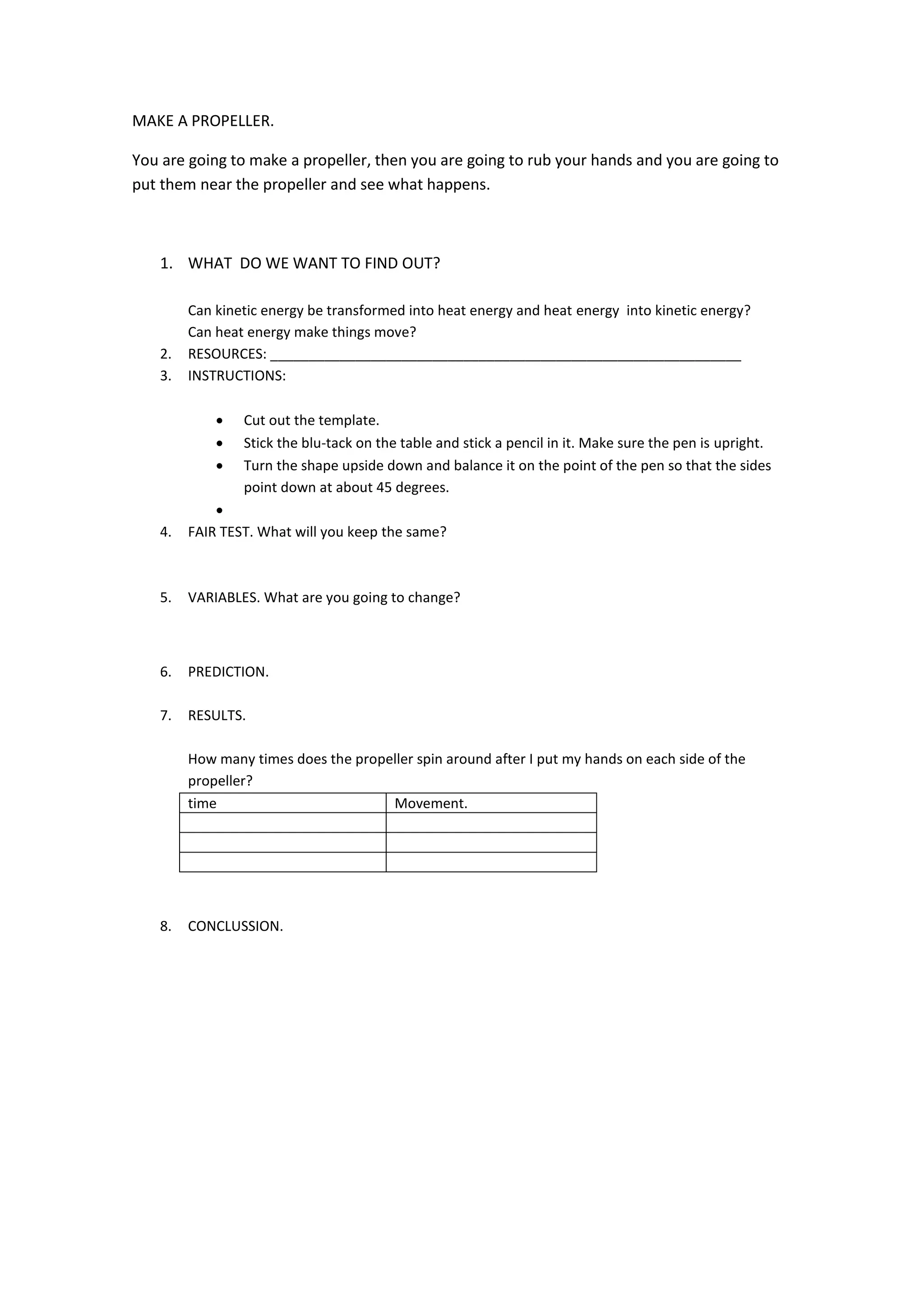 The document provides instructions for making a propeller out of paper to test whether heat energy from rubbed hands can cause kinetic energy motion in the propeller. Learners will cut out a propeller template, balance it on a pencil, rub their hands to generate heat energy, and place their hands near the propeller to see if it spins, with the goal of determining if heat energy can transform into kinetic energy and vice versa.